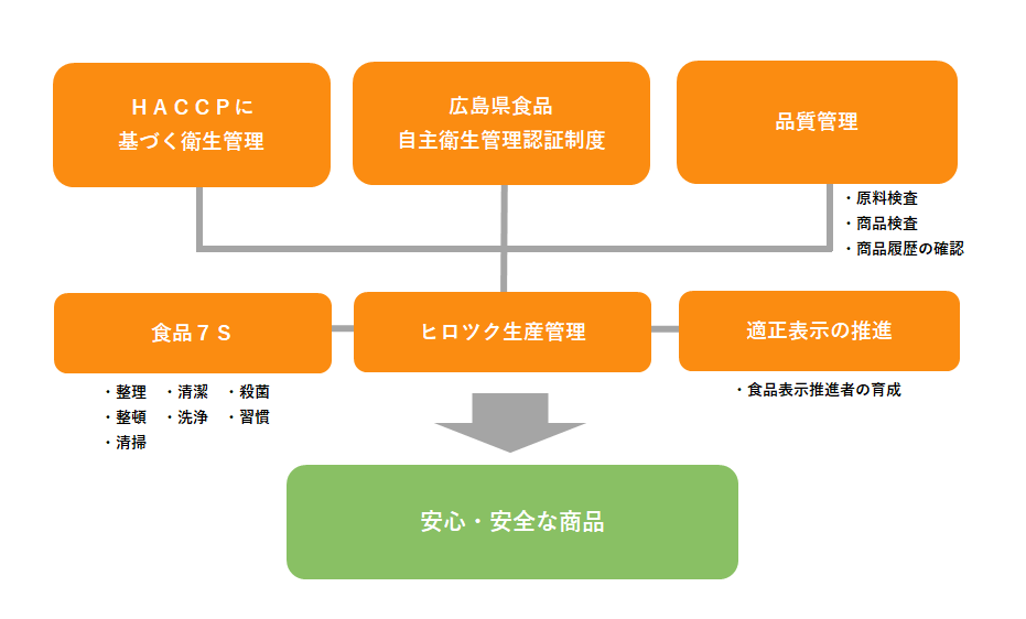 広島県食品自主認証制度を導入し、HACCPに基づく衛生管理を徹底し、より安全で衛生的な環境つくりを行っています。